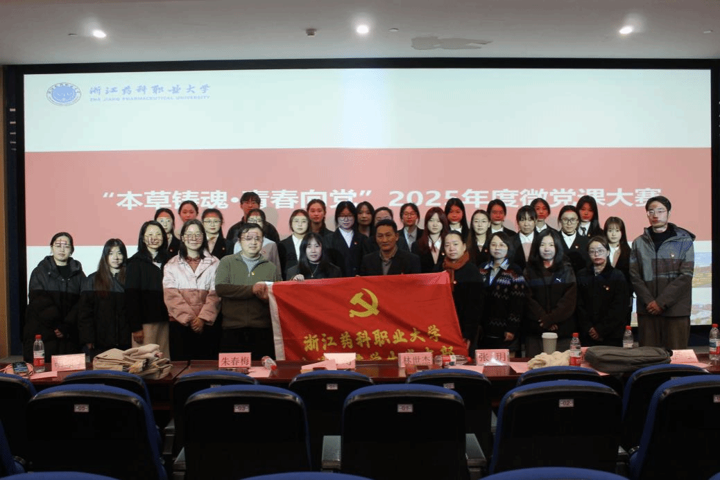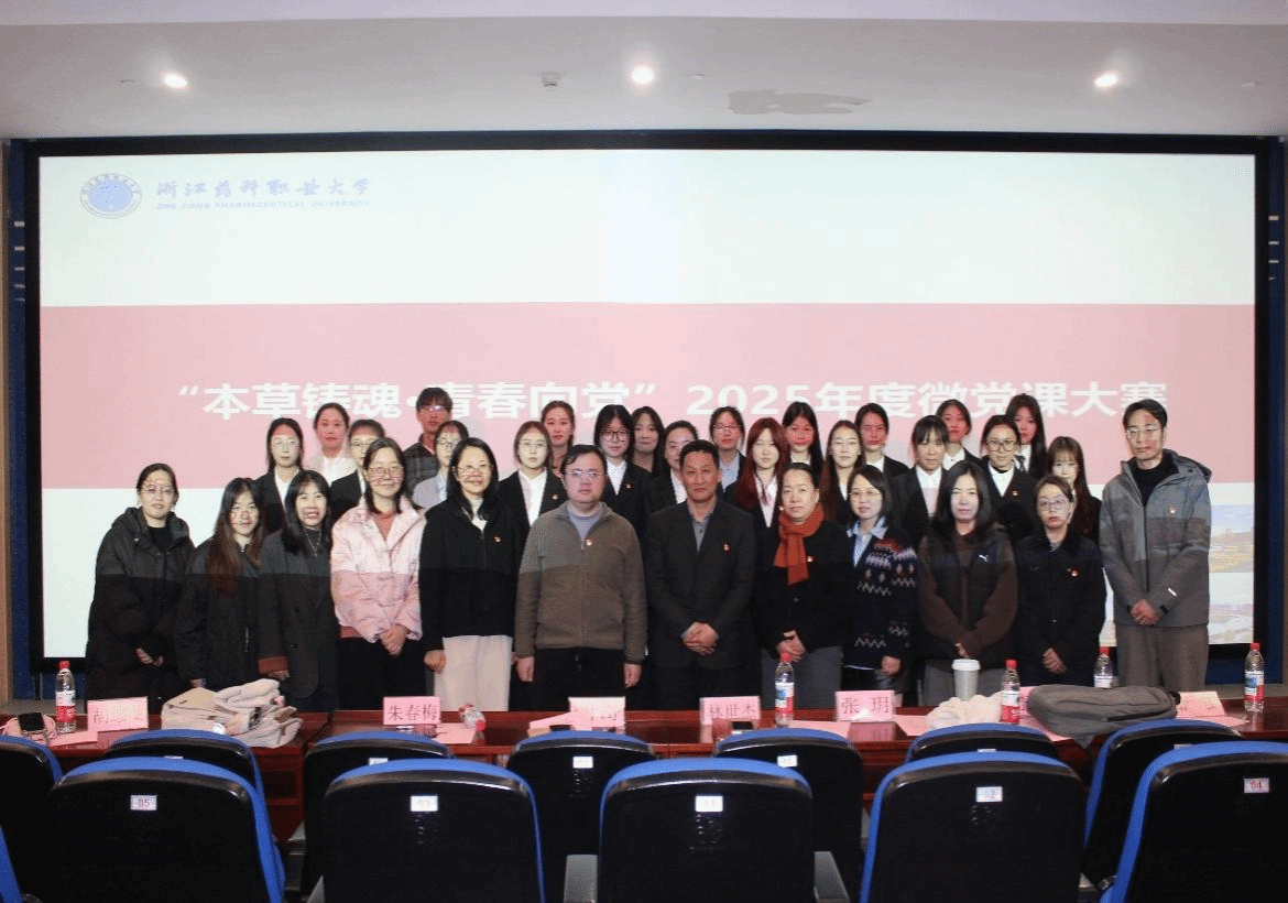 为深入学习贯彻党的二十届四中全会精神,帮助广大青年党员筑牢信仰之基,推动党建与育人工作深度融合,中药学院学生支部在奉化校区举行了“本草铸魂·青春向党”微党课大赛。学院党委书记谢奇、党委副书记林世杰,学院党委委员、学生第二党支部书记朱春梅,学生第一党支部书记陈珊珊及学生支部全体师生党员、入党积极分子齐聚一堂,共赴这场以言为媒、以志为灯的红色之约。